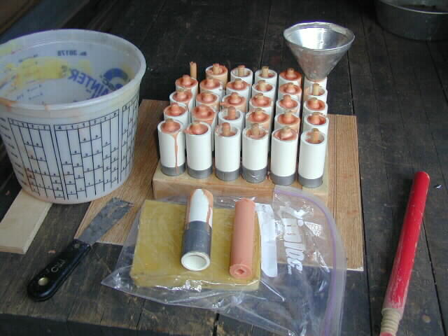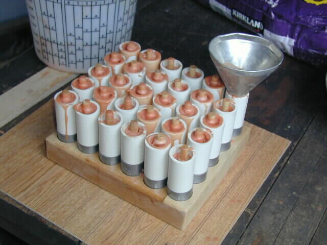 Pouring into the moulds using an aluminum funnel with the bottom cut out to just fit the tubes.