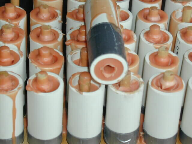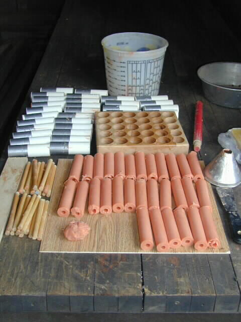 To make a mould: Use a 2" thick block of wood, drill holes for the PVC pipe with a spade or Forstner bit (flat bottom) to within 1/2" of the bottom. Using the big drill bits center hole as a guide, drill on through with a 3/8" bit for a core hole (if needed). My bit did not fit the pipe exactly so I wrapped some duct tape until the pipe fit snuggly.