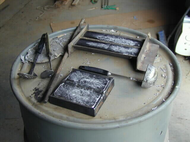 Pouring into ingot moulds. The old steel soup ladle held about 2 1/2 lbs. and worked very well.